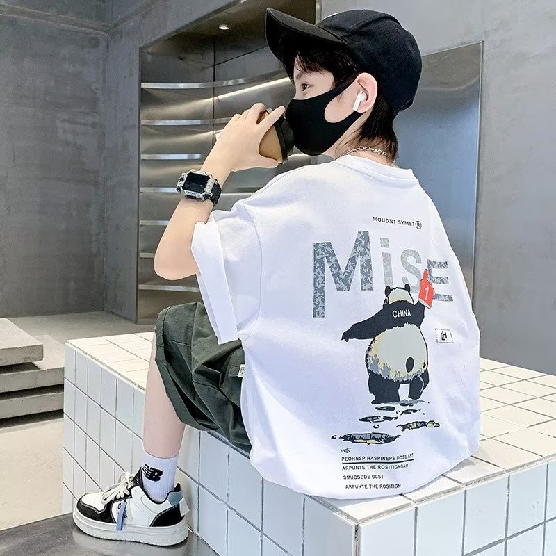 ボーイズ Tシャツ半袖夏 2025 新しい子供純綿白ルーズ半袖中大型子供ストリート夏服トレンド