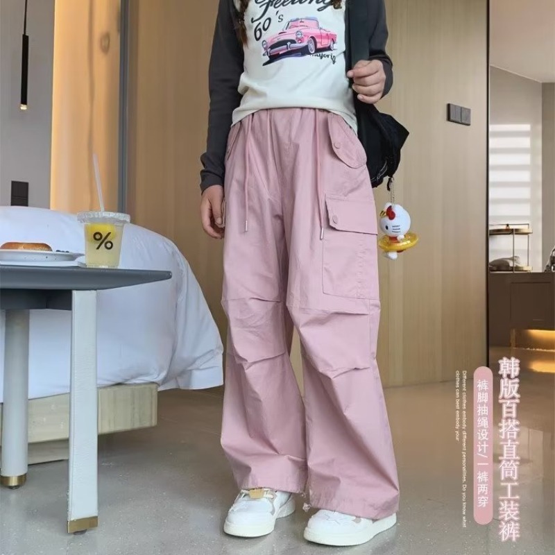 女の子の韓国版のポケットの服装のズボンの2024春秋の新型の中で大きい子供のファッションの傘の兵のズボンの子供は口のストレートなズボンを閉じます。
