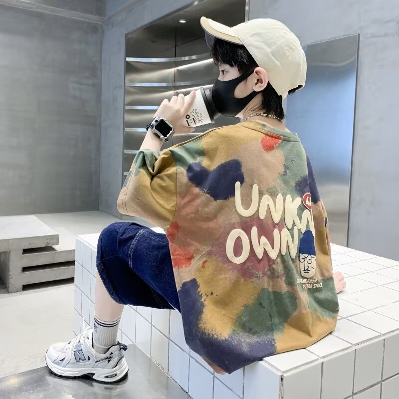 子供用半袖tシャツ2024年夏新作男児用ゆるいボトムシャツ中の大きい子供が半袖のtシャツを染めています。