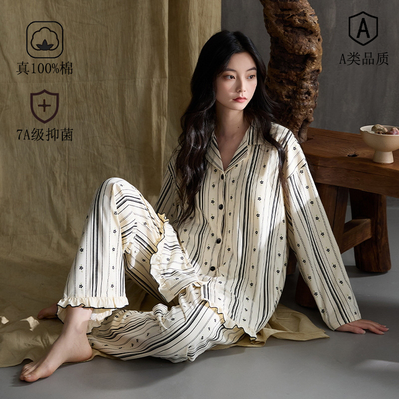 A類抗菌100% 純綿女性パジャマ女性タイプ春秋長袖カーディガンカジュアルで家庭服女性を着ることができる