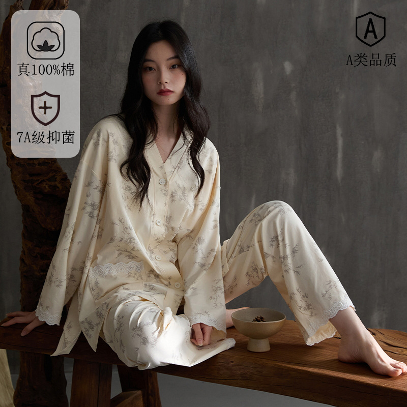 クラスA抗菌100% 純綿パジャマレディース春秋レディース長袖カーディガン四季着ホームウェアレディース