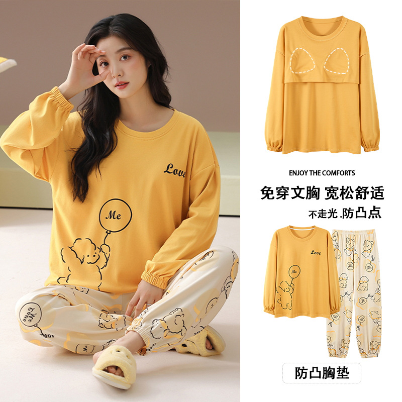 A類抗菌純綿パジャマ女性秋冬長袖ゆったり胸パッド付き女性ホームウェア足元セット