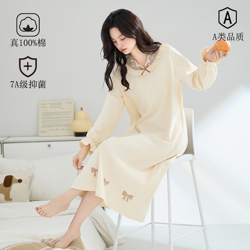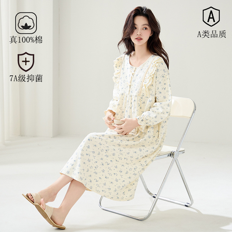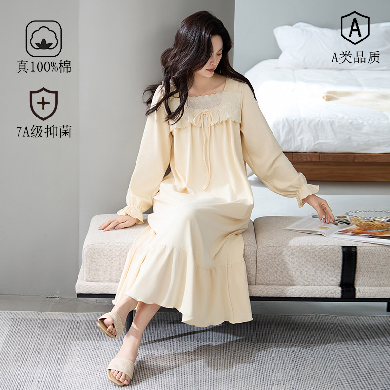 A類抗菌パジャマ女性春秋綿長袖ミディアムワンピース大サイズプリンセス風綿パジャマ