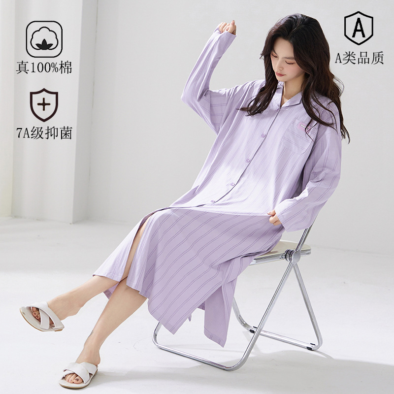 クラスA抗菌純綿パジャマレディース春秋長袖カーディガン大きいサイズロングワンピースレディース高級感パジャマ