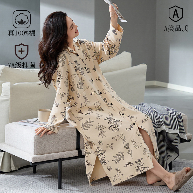 クラスA抗菌女性寝スカート女性春秋長袖カーディガン大サイズワンピース女性高級感綿パジャマ女性