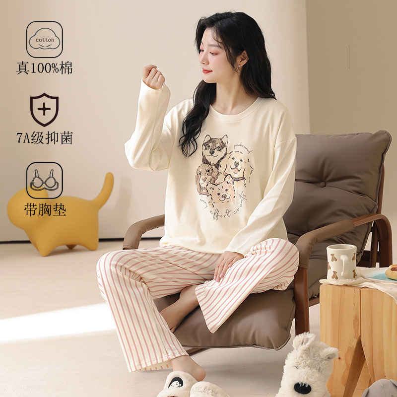 パジャマの女性春秋のタイプは胸のパッドの2024の新型の秋の韓国版の長袖の純綿のレジャーの女性の部屋の服のスーツを持ちます。
