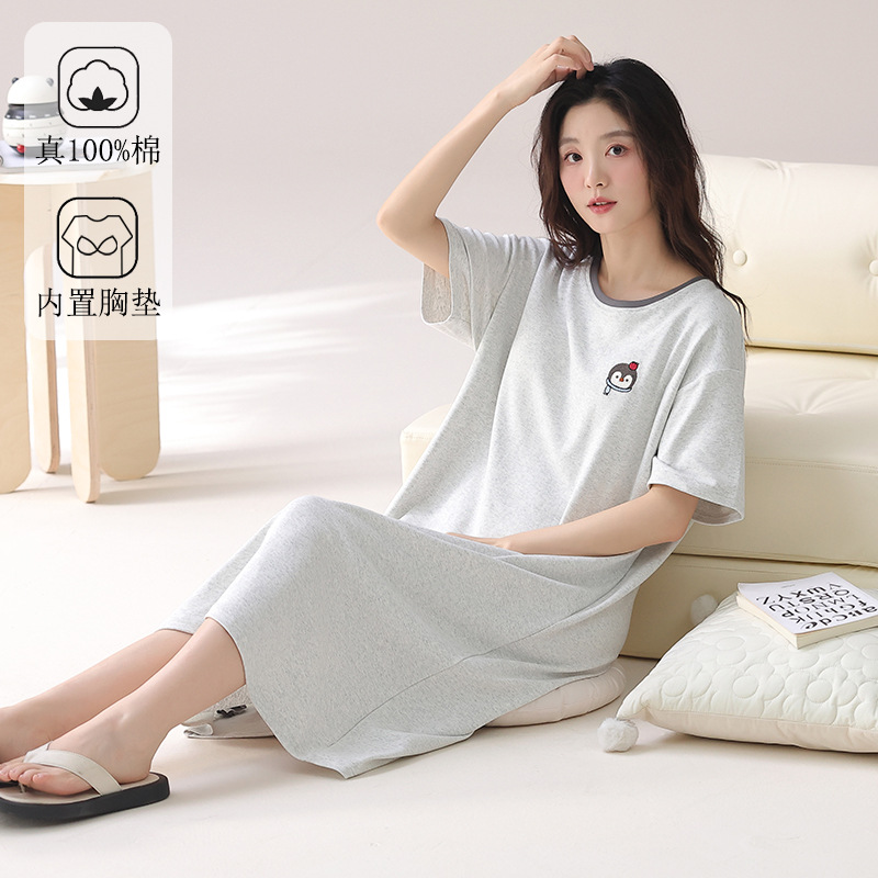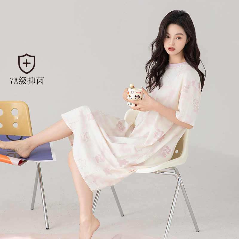 クラスA抗菌綿ナイトガウン女性用夏半袖ドレス女性用ミドル丈プルアップ綿涼しいパジャマ女性用