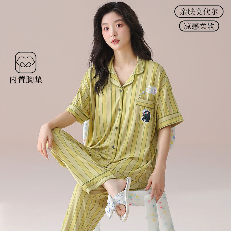 女性用モーダルパジャマ、胸パッド付き、夏用アイスシルク半袖少女漫画、屋外で着用可能、女性用クールホーム服