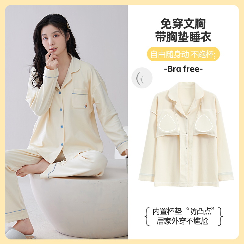 胸パッド付きパジャマ女性モデル春秋冬純綿長袖カーディガン2024新純色カジュアルルームウェアセット