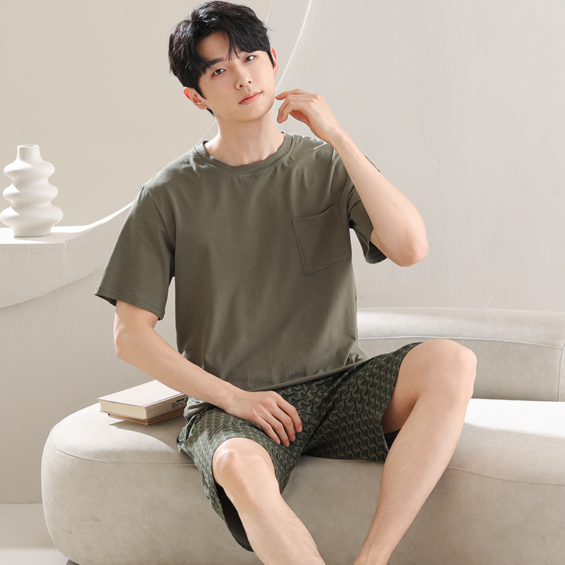 男性用ラフコットンパジャマ、夏用純綿半袖ズボン、高級感、屋外で着用可能、涼しいホームウェアメンズスーツ