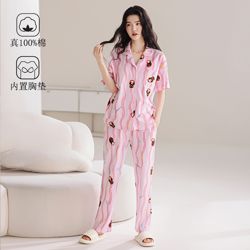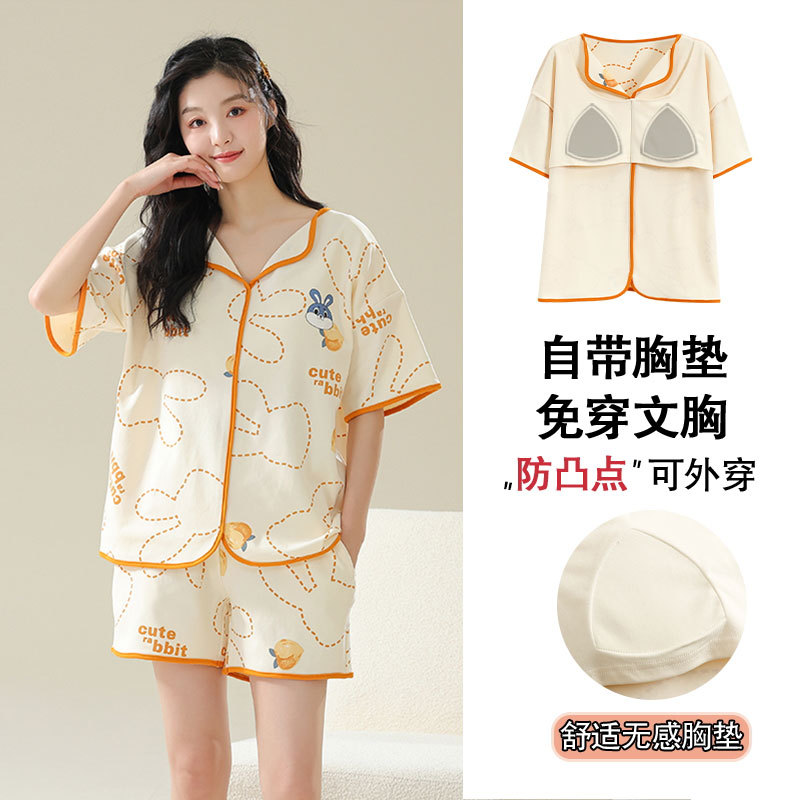 胸パッド付き女性用パジャマ、女性用夏用純綿半袖ズボン、カーディガン、少女漫画、大きいサイズの綿のホーム服