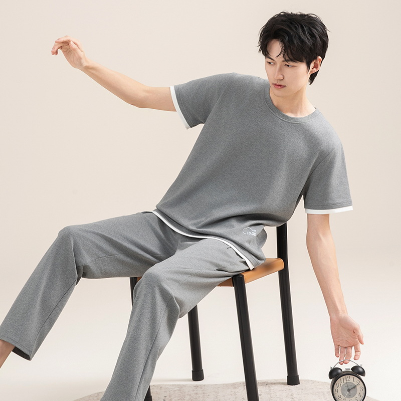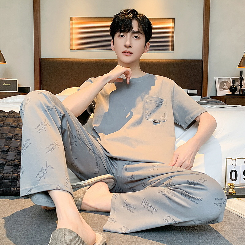 青少年パジャマ男性夏純綿半袖長ズボン丸首カバーカジュアル綿家庭服男性モデル