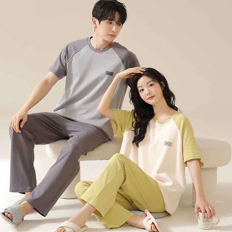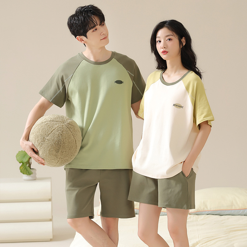 女性用胸パッド付き綿100%パジャマ、夏のカップルスタイル、半袖ズボン、ラウンドネック、屋外で着用可能、男性用綿ホーム服