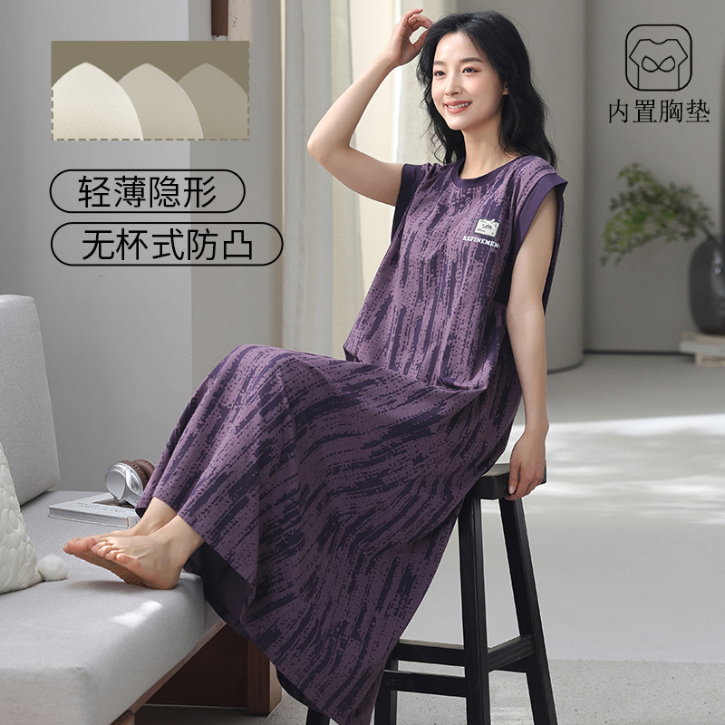 女性の胸パッド付きのパジャマ女性の夏の綿のベストのノースリーブのワンピースの長いタイプのフレームのさわやかな綿の涼しさのパジャマの女性