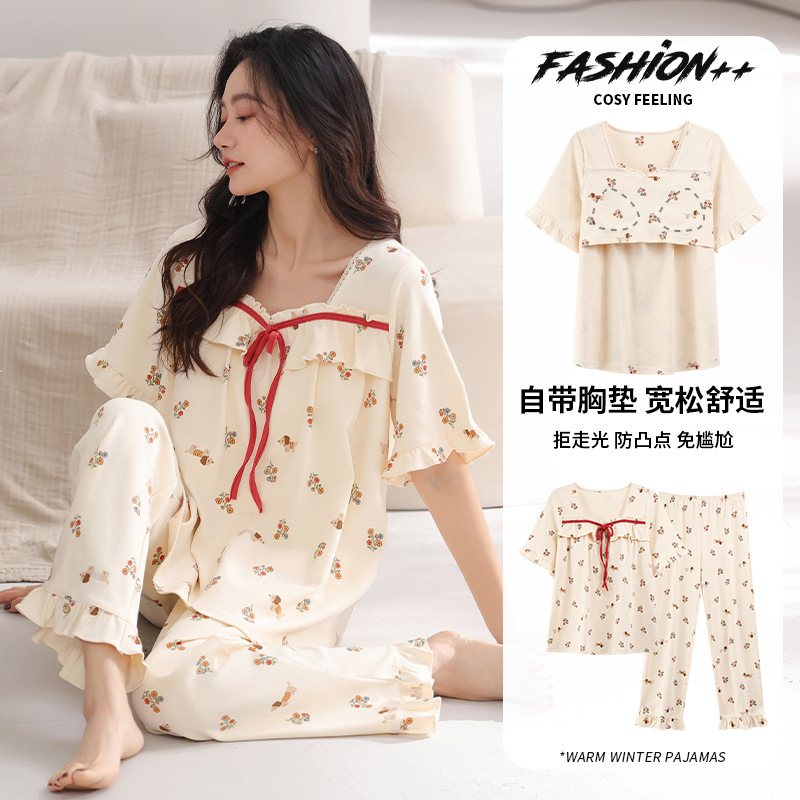 胸パッド付き綿 100% パジャマ、女性用夏の純綿半袖ズボン、高級女子学生綿ホーム服