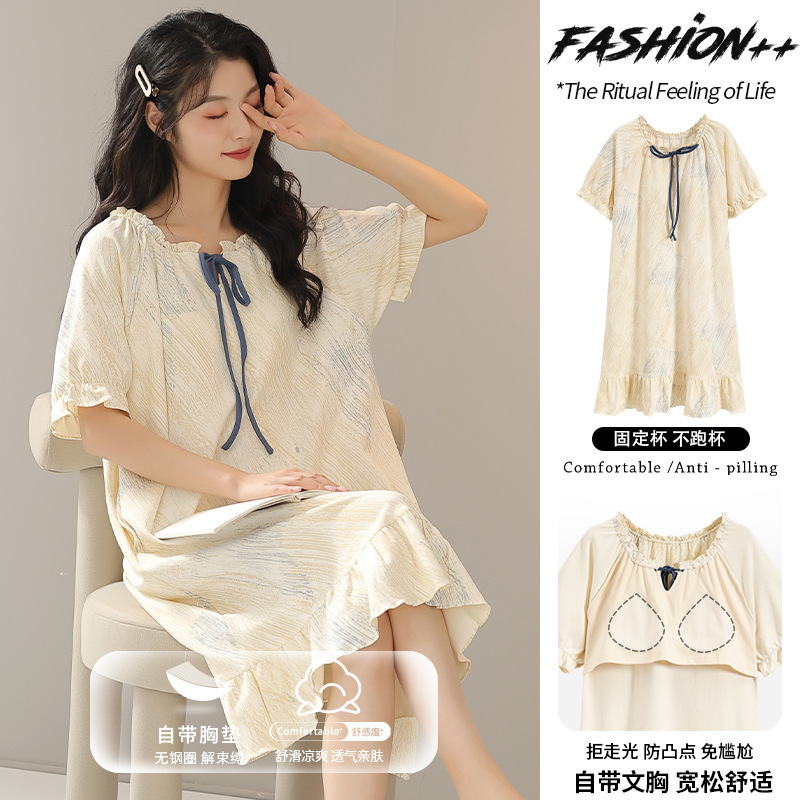女性は胸パッド付きのパジャマの女性の夏の綿の半袖の中の長いワンピースの甘いかわいい綿のパジャマの女性