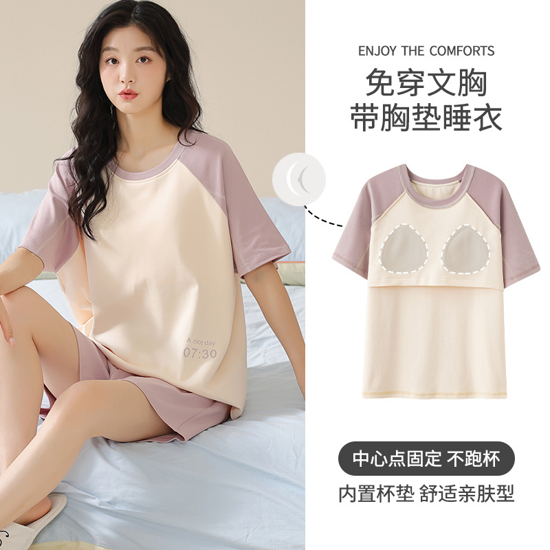 クラスA抗菌綿100%カップルパジャマ女性用胸パッド付き半袖ショーツショーツは綿のホーム服の外でも着用できます