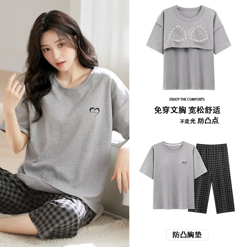女性用胸パッド付きパジャマ、夏用純綿半袖クロップドパンツ、女性用シンプルカジュアル高級綿ホームウェア