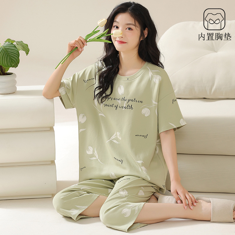 女性のパジャマ、胸パッド付き夏の純綿半袖クロップドパンツ、プラスサイズの女の子の綿のホームウェアセット