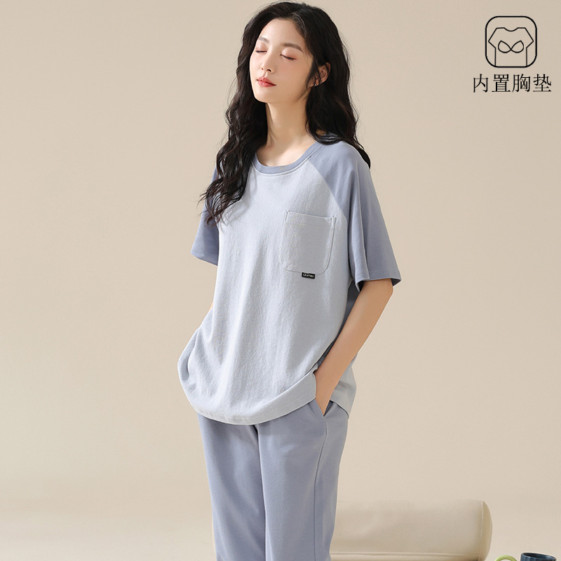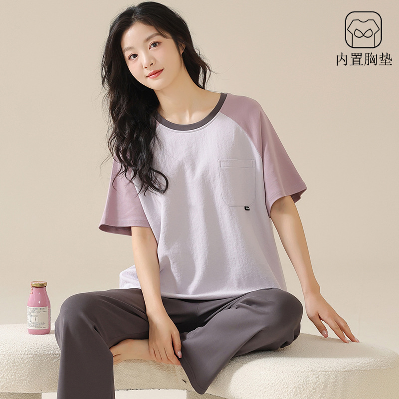 女性用パジャマ、胸をカバーする胸パッド付き夏用純綿半袖ズボン、膨らみ防止、下着なし、綿ホームウェアセット