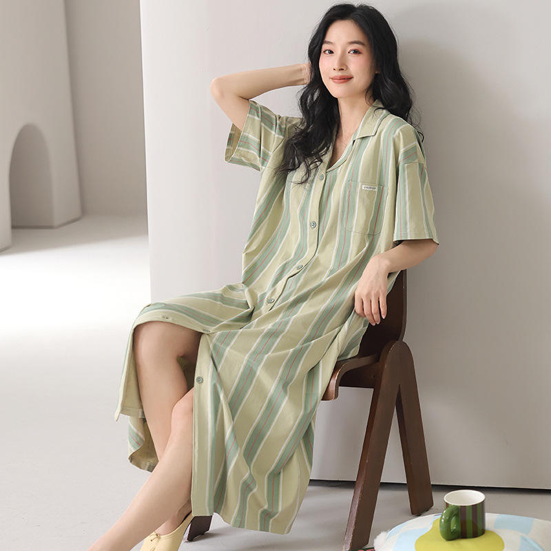 女性のナイトガウン、女性の夏の純綿半袖カーディガンドレス、ロングカジュアルウェアラブルプルアップ綿パジャマ、女性用