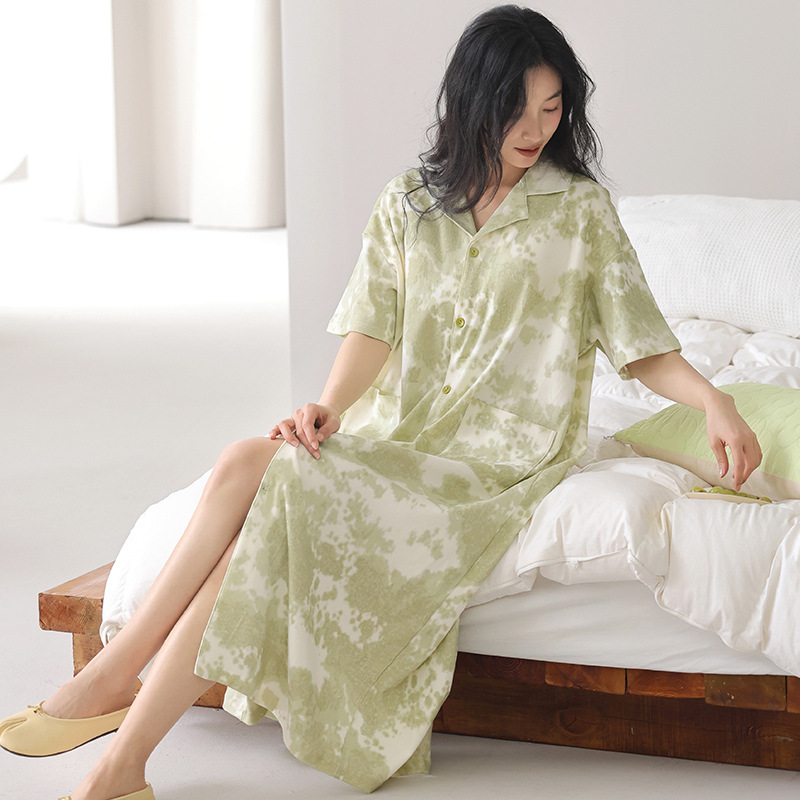 夏の女性の寝スカートの女性の綿の半袖のカーディガンのワンピースの女性の長いスカートはカジュアルで外に着ることができます。