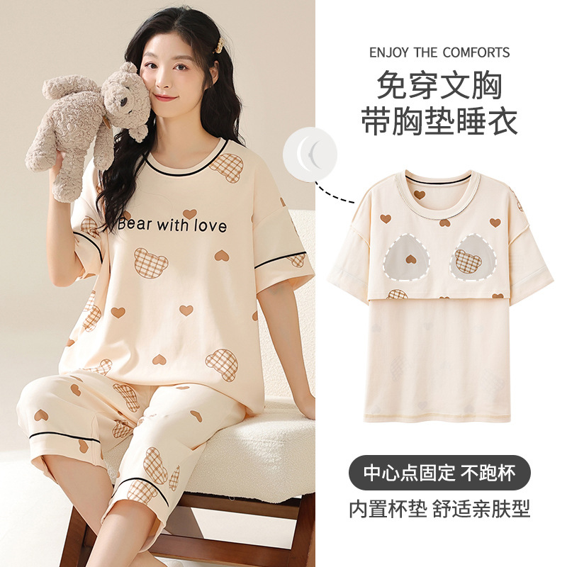 100% 綿胸付きパジャマ女性夏綿半袖七分ズボンアニメかわいい綿家庭服女性モデル