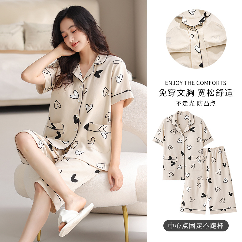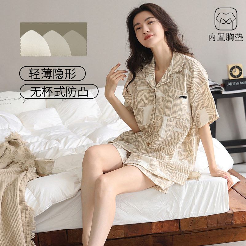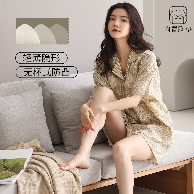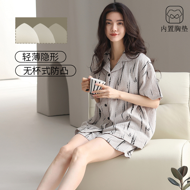 胸パッド付き純綿ガーゼ綿パジャマ、女性用夏用半袖カーディガン、屋外で着用可能、綿ホームウェア、女性用スーツ