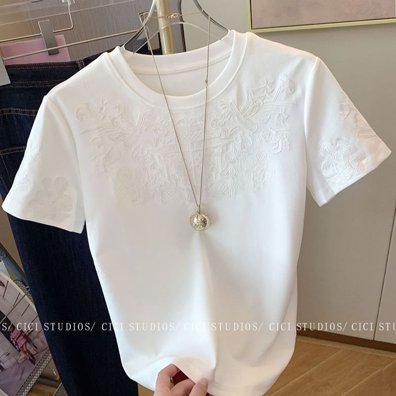 カウンターで残りの注文を取り下げました〜新しい中国風の重刺繍半袖Tシャツ女性用2025夏スリムラウンドネック純綿トップ
