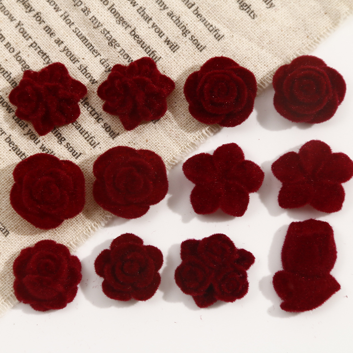 秋冬のレトロな植毛のベルベットのワインの赤いバラのツバキの花の樹脂はDIYのアクセサリーの部品を貼って卸売りします。