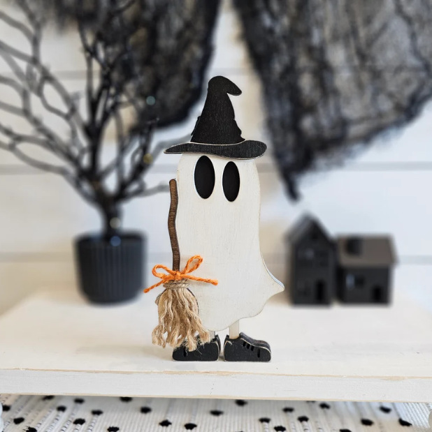 ハロウィーンの幽霊のほうきは家の装飾品のパーティーのデスクトップを飾って幽霊のカボチャの層のトレーを飾って飾ります。