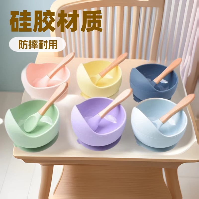 工場直売のシリカゲルの碗のスプーンのセットの赤ちゃんの補助の碗のスプーンの乳幼児の碗のスプーンは食事を学んで皿の碗を吸うことを訓練します。