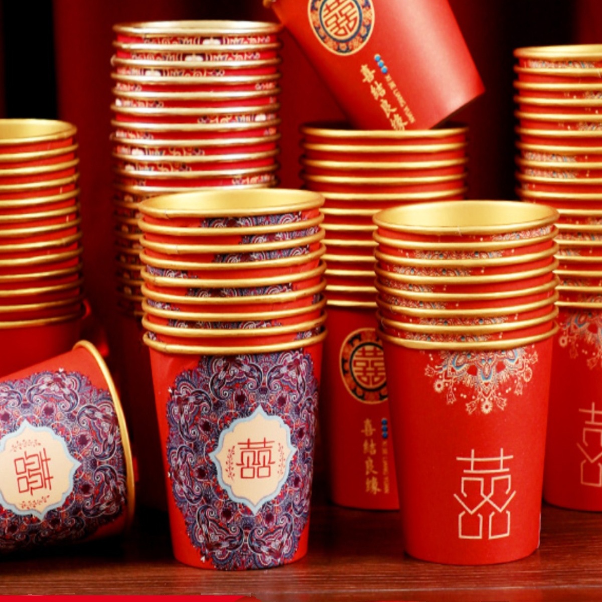 既製の結婚式の使い捨て紙コップ金箔増粘結婚式のカップ結婚式の宴会水カップ家庭用赤い結婚式のお茶