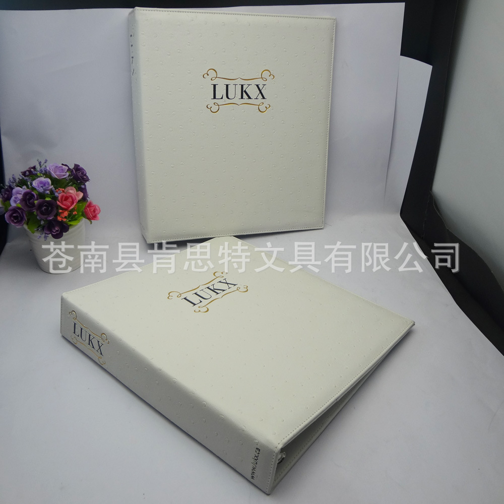 加工箔押しロゴ白色ダチョウ柄puファイル金属三穴クリップ模造皮ファイルA4