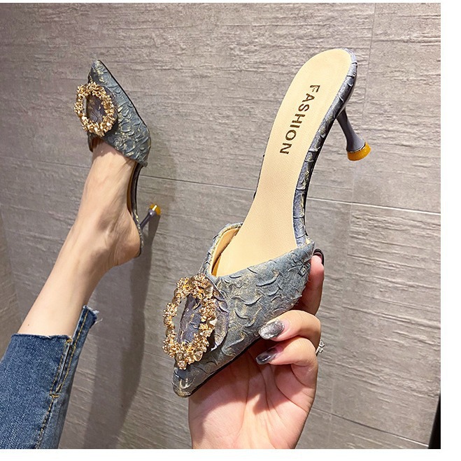 2024夏の新型シンプルなハイヒールの1字の涼しい猫とハイヒールの靴のフランスの女性は半スリッパのデニムを着ます。
