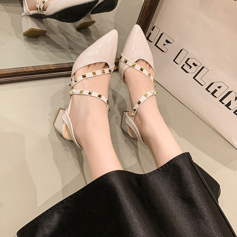 フレンチヌードスタイルの女性用シングルシューズ 2024 新しいリベット中空小さな革靴夏のスカートとハイヒールサンダル