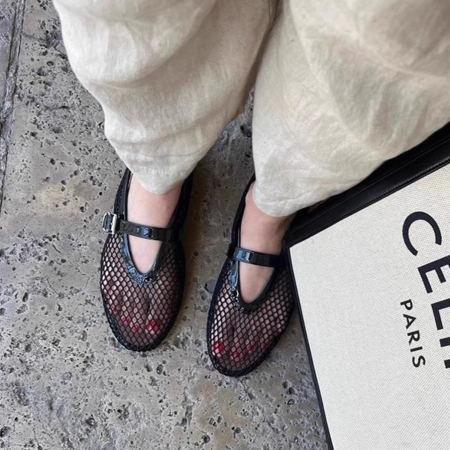 フレンチスタイル中空バレエシューズ女性フラットワンラインバックルメタルメッシュメリージェーンシューズ女性ニッチデザインシングルシューズ