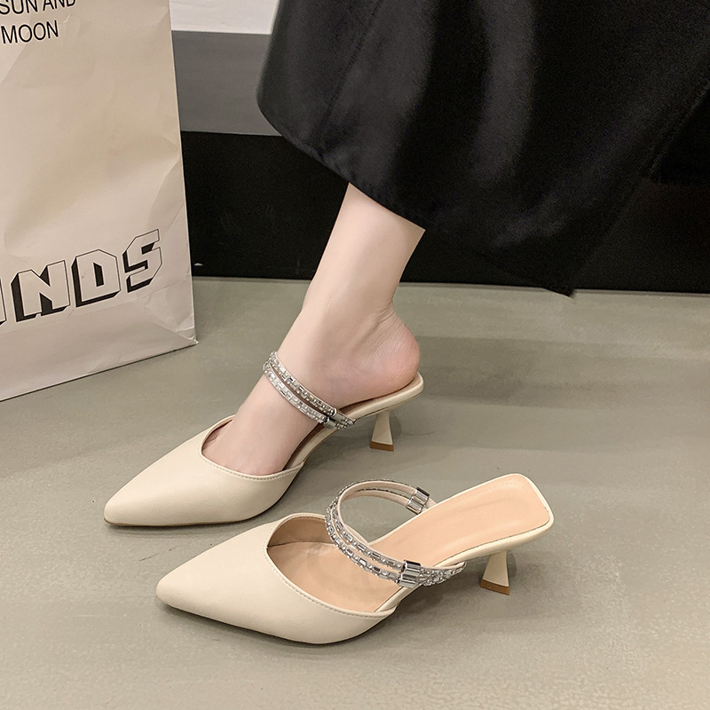 包頭サンダル女性のミディアムヒールツーウェアスリッパ夏アウターポインテッドトゥスティレットヒールラインストーンバックシングルシューズ女性のための 2025 新しいスタイル