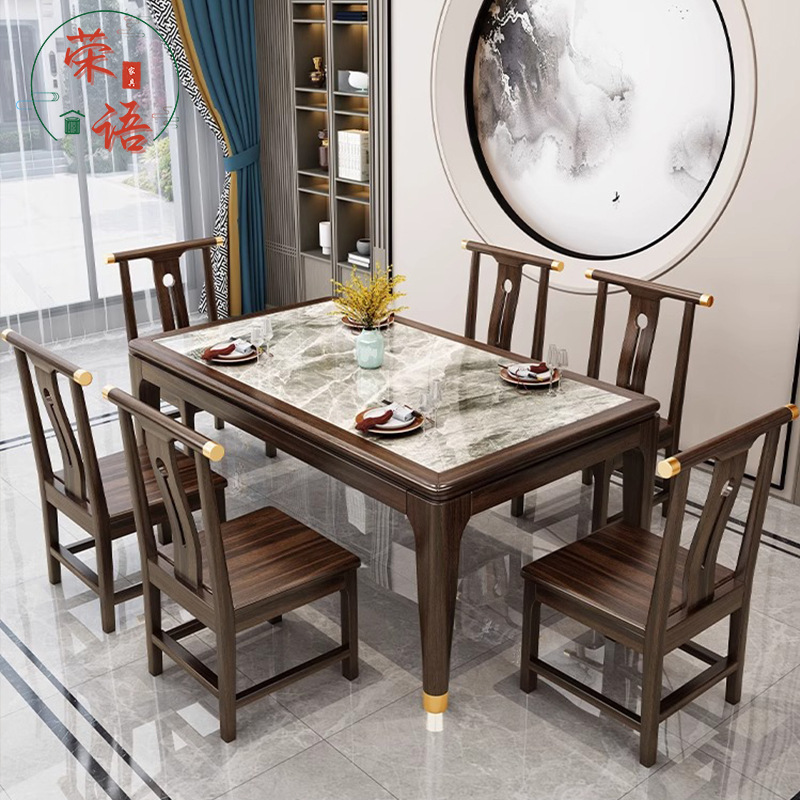 新中国式の軽い豪華な烏金木のテーブルと椅子の組み合わせの長方形の岩板の小戸型の家庭用レストランの家具