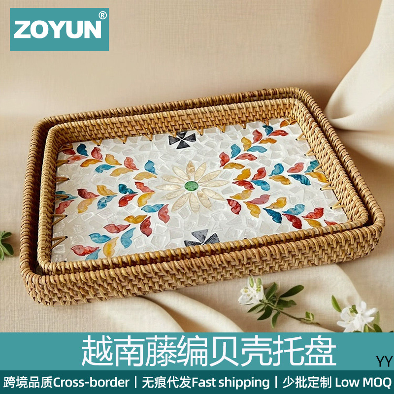 ベトナム籐シェルトレイホテルレストランライト高級カラーシェルティートレイB&Bお茶スナックドライフルーツトレイ収納バスケット