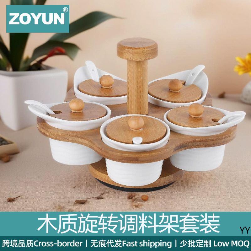 回転式セラミック調味料瓶セット 5点セット ポータブル スプーンと蓋付き 5コンパートメント調味料ボックス 調味料収納瓶