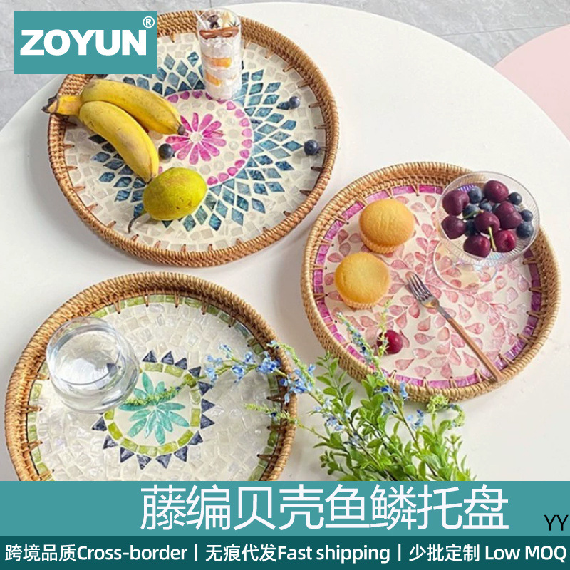 ベトナム藤編貝殻トレー軽豪華彩貝円形果物皿パンかごレストランコーヒー菓子皿収納皿