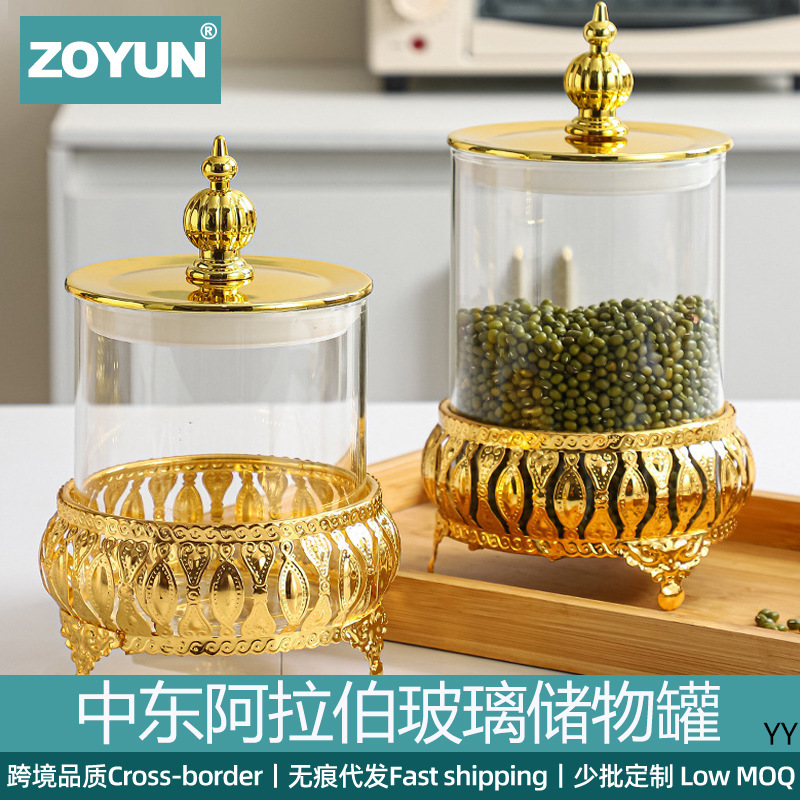 中東アラブガラス貯蔵タンクメッキ金色ヨーロッパ風茶何糖果缶蓋付き雑穀密封収納タンク