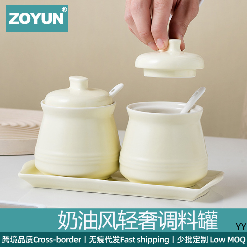 北欧クリーム風軽贅沢陶磁器調味缶蓋付きキッチン調味料箱2点セット家庭用塩缶調味瓶