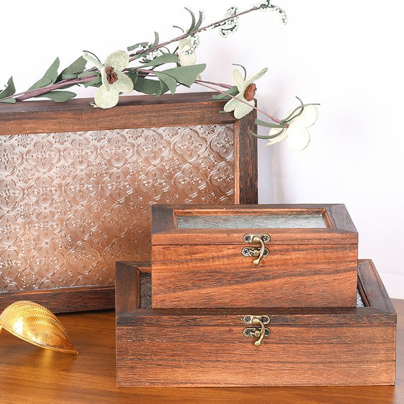 木箱収納ボックスベゴニアフラワーガラスレトロ木製デスクトップ雑貨整理フリップトップ装飾化粧台装飾ボックス