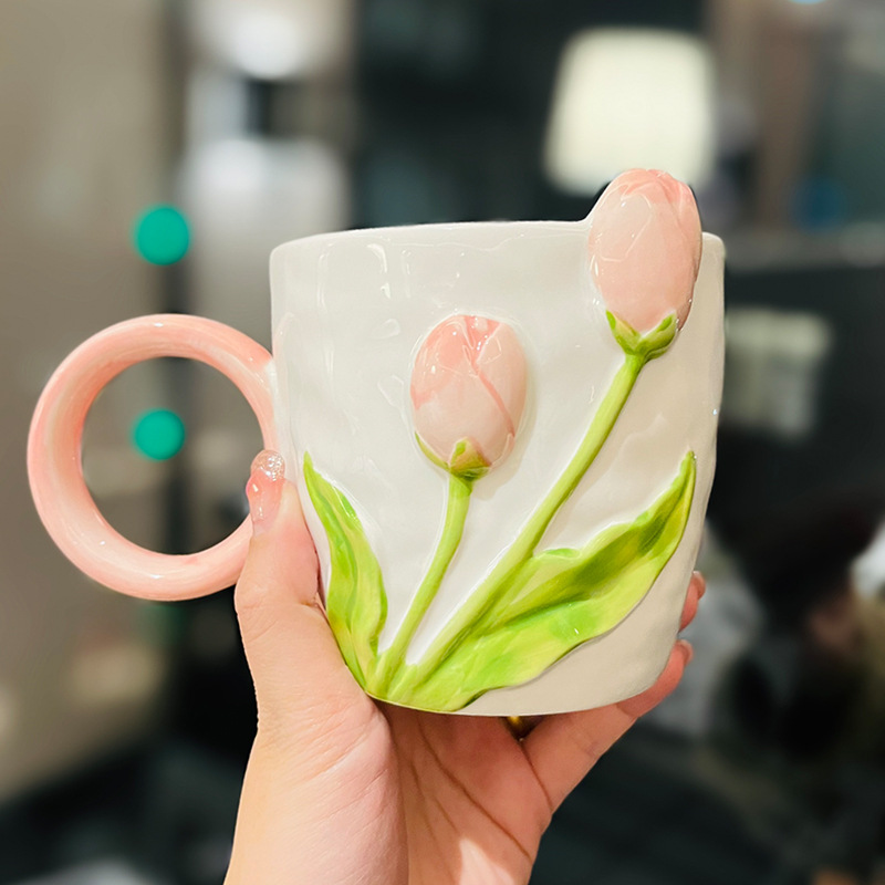 女の子高颜値ピンクチューリップマグカップ陶磁器釉薬下彩家庭用飲料カップ朝食牛乳オート麦カップ