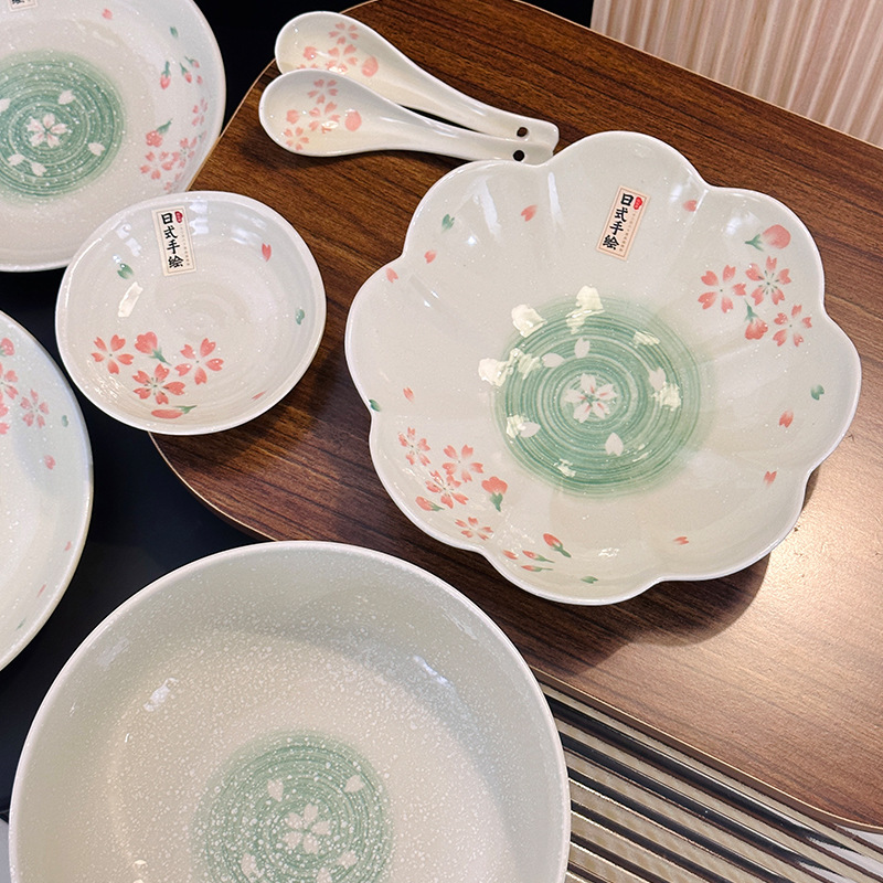 和風桜花粉陶磁器皿セット釉薬下彩高颜値茶碗スープ皿ラーメン皿