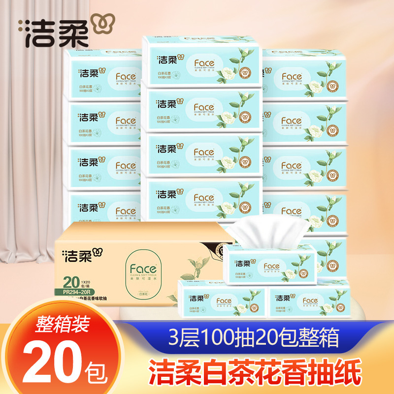 洁柔抽纸白茶花香纸巾3层100抽20包整箱家用可湿水餐巾纸面巾纸抽
