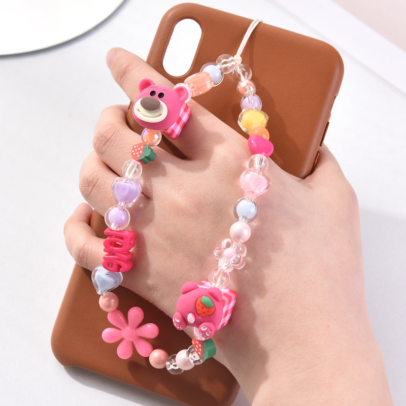新しいビーズの携帯電話のストラップの漫画のイチゴの熊の四角の装飾品の部品の携帯電話の携帯電話のブレスレットのストラップは国境を越えてよく売れています。
