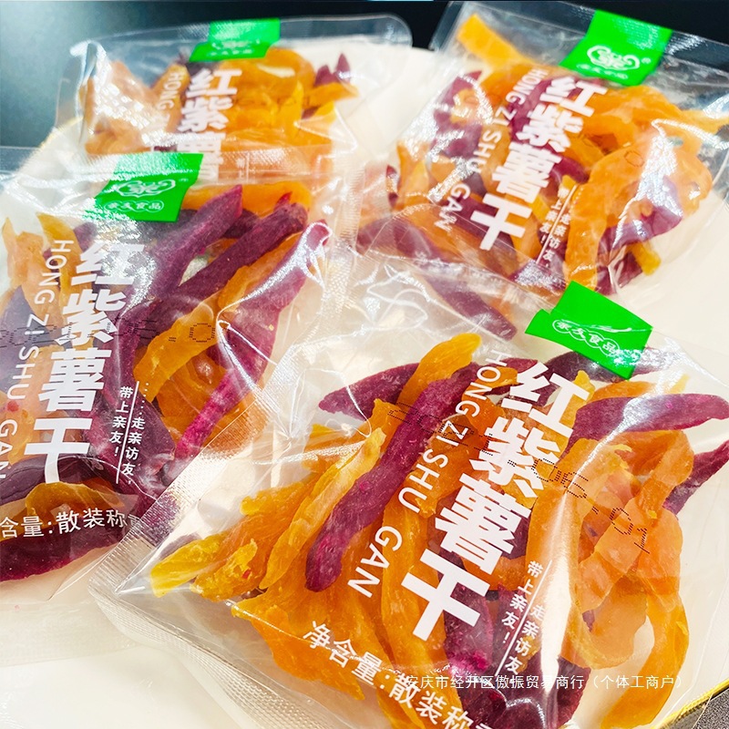 親戚や友人向けの紫干し芋、農家製フライドポテト、独立した小包装のスナック、干し芋